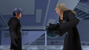 Later on escaping from Riku, Zexion appears in the coming together room he shared with Lexaeus and Vexen, flabbergasted as to how Riku can clothing darkness the manner he does as no i has ever done then before. Waiting for him are Axel and a companion. In a panic, Zexion thinks Axel's companion is Riku himself, but then realizes it'due south only the Riku Replica. Zexion suggests they pit the replica against the real Riku, though Axel directs the replica's attention to his lack of wholeness. He tells him that if he can find forcefulness that the real Riku doesn't have, he can become a whole person of his own, rather than a mere boob or whole copy of Riku.