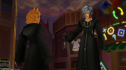 During Xion's nightmare on Destiny Islands, Roxas stands on the beach of the isle, missing his friend. He after sees the hooded Xion and approaches her. She removes her hood and turns out to be none other than Zexion, who proceeds to taunt a younger version of Riku as he did in Kingdom Hearts: Chain of Memories. The scene then begins to fade, Xion (in the grade of the shocked Roxas) undergoing a series of transformations until she finally takes Sora's form for the kickoff time.